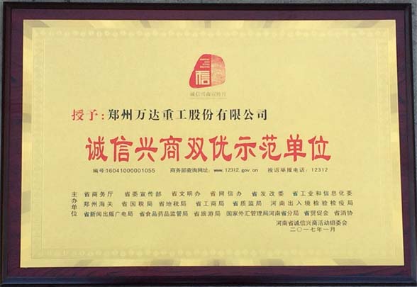 熱烈祝賀鄭州萬(wàn)達(dá)重工股份有限公司及公司董事長(zhǎng)、書(shū)記何清先生獲的“誠(chéng)信興商雙優(yōu)示范單
