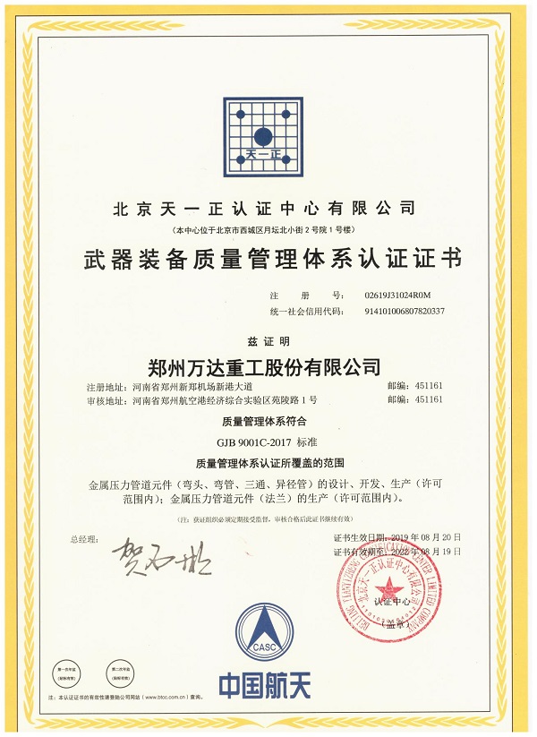 該證書(shū)的取得,意味著萬(wàn)達(dá)重工在軍品產(chǎn)業(yè)的質(zhì)量管理能力和水平達(dá)到了新版國(guó)軍標(biāo)質(zhì)量管理體系的要求,也表明了公司生產(chǎn)特種金屬壓力管道元件產(chǎn)品的質(zhì)量符合承擔(dān)軍品任務(wù)的要求,對(duì)于公司進(jìn)一步提升產(chǎn)品質(zhì)量管理水平、提升生產(chǎn)服務(wù)能力、開(kāi)拓軍品市場(chǎng)、滿足軍方對(duì)武器裝備的質(zhì)量要求具有十分重要的意義。