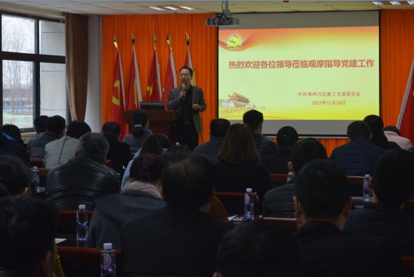 2017 年11 月29 日上午,實(shí)驗(yàn)區(qū)黨工委組織部組織區(qū)機(jī)關(guān)黨工委、各辦事處(IT 社區(qū))黨工委、興港公司黨委和港區(qū)7家非公企業(yè)黨建負(fù)責(zé)同志62 人蒞臨萬達(dá)重工黨支部觀摩指導(dǎo)黨建工作。萬達(dá)重工黨支部副書記于江山、紀(jì)律委員薛如勛、宣傳委員張夢(mèng)珠等人隨行陪同并講解企業(yè)運(yùn)營、企業(yè)文化及黨建工作情況。