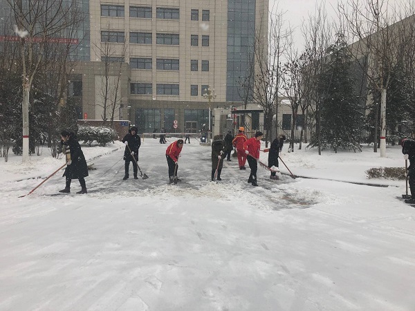勞動現(xiàn)場,全體黨員不畏嚴寒,協(xié)調(diào)配合、齊心協(xié)力,用鐵鍬和掃帚等工具清掃公司廠區(qū)內(nèi)積雪,大家爭先恐后,干勁十足,忙碌的身影構(gòu)成了一道亮麗的風景線。經(jīng)過近兩個小時的奮戰(zhàn),將廠區(qū)大門前、車庫前、行政樓前主要道路的積雪清掃干凈,為大家開辟了一條洋溢著溫情的通暢之路。