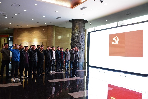 參觀結(jié)束后,在中原英烈紀念館一樓展廳內(nèi),面對鮮紅的黨旗,全體黨員胸佩黨徽,由于副書記領(lǐng)誓,大家舉起右拳,高聲重溫了入黨誓詞。隨后,集體觀看了“不忘初心、牢記使命”主題教育宣傳片。