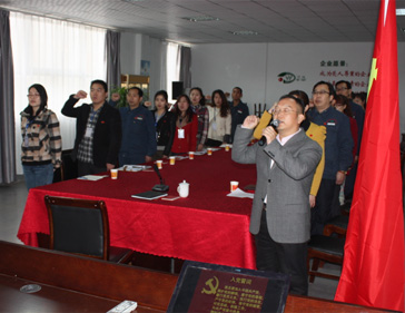 2014年3月19日上午9:00公司支部全體黨員在會議室召開第一次黨員大會,整個會場莊嚴而肅穆。 大會分5個議程,在此會上,全體黨員面對黨旗和鮮艷的五星紅旗在支部書記何總的帶領下重溫入黨誓詞,全體黨員再次認真全文學習了黨章,并選舉產(chǎn)生了支部委員。