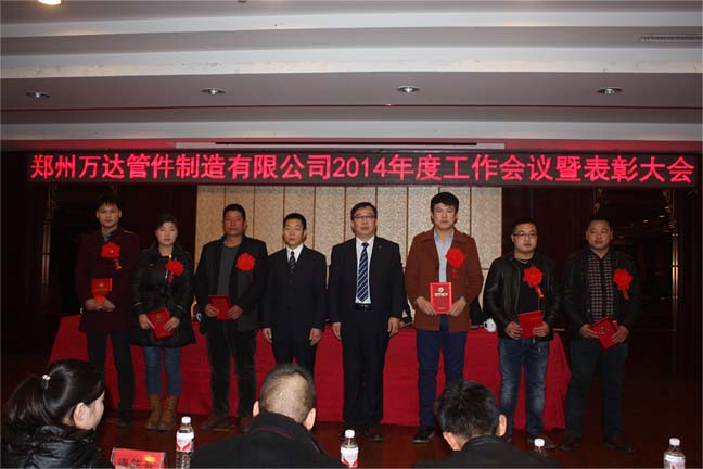 鄭州萬(wàn)達(dá)管件制造有限公司2014年年會(huì)于2015年1月20日隆重召開(kāi)。會(huì)議首先表彰了公司2014年度先進(jìn)工作者、先進(jìn)部門(mén)及班組、優(yōu)秀干部、年度進(jìn)步之星、銷(xiāo)售冠軍、優(yōu)秀黨員等十余個(gè)獎(jiǎng)項(xiàng),并對(duì)獲獎(jiǎng)?wù)哳C發(fā)了獎(jiǎng)金和證書(shū)。公司董事長(zhǎng)、黨委書(shū)記何清同志在會(huì)議上做了題為《適應(yīng)新常態(tài) 開(kāi)創(chuàng)新局面 實(shí)現(xiàn)公司持續(xù)健康穩(wěn)定發(fā)展 》的報(bào)告,總結(jié)了2014年公司的發(fā)展歷程,取得的成績(jī)和不足,展望和部署2015年公司發(fā)展的目標(biāo)和重點(diǎn)工作,為公司全力建設(shè)五位一體的萬(wàn)達(dá)事業(yè)指明了努力方向。公司全體人員中午舉行了盛大的團(tuán)拜招待會(huì),歡聚一堂,其樂(lè)融融。