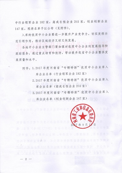 按照《河南省工業(yè)和信息化委員會辦公室關于建立河南省優(yōu)質中小企業(yè)庫的通知》(豫工信辦企業(yè)【2017】20號)的要求,經過自愿申報、逐級推薦、專家評審、網上公示等程序,鄭州萬達重工股份有限公司成果入選河南省“專精特新”優(yōu)質中小企業(yè)庫,被認定為行業(yè)領軍企業(yè)。
