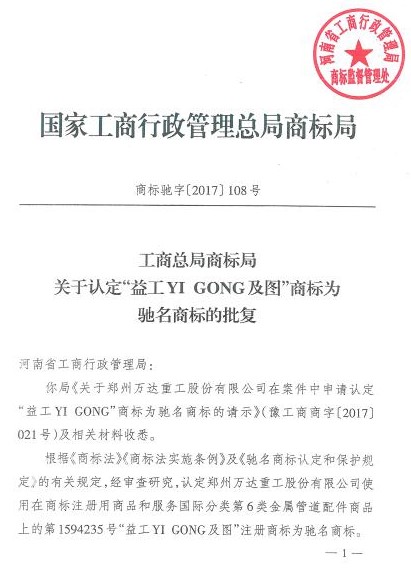 熱烈祝賀鄭州萬達重工股份有限公司“益工”商標(biāo)被認(rèn)定為中國馳名商標(biāo)