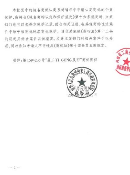 根據(jù)國家工商行政管理總局商標(biāo)局下發(fā)的商標(biāo)馳字【2017】108號《工商總局商標(biāo)局關(guān)于認(rèn)定“益工 YI GONG及圖”商標(biāo)為馳名商標(biāo)的批復(fù)》文件,公司使用在商標(biāo)注冊用商品和服務(wù)國際分類第6類金屬管道配件商品上的“第1594235號益工YI GONG及圖”商品被認(rèn)定為中國馳名商標(biāo)”,這不僅是公司商標(biāo)保護的重大成果,也實現(xiàn)了鄭州航空港經(jīng)濟綜合實驗區(qū)馳名商標(biāo)零的突破。