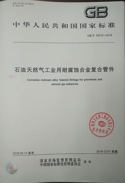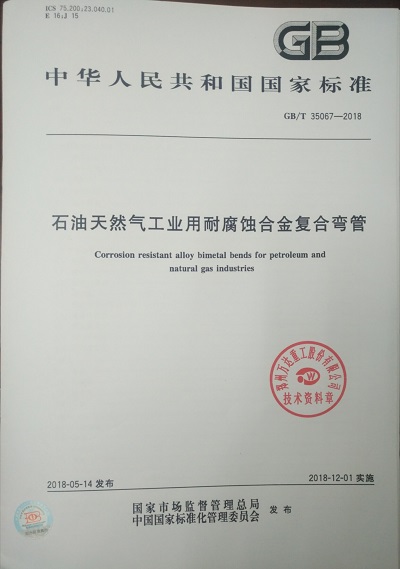 2018年5月14日,國家市場監(jiān)督管理總局、國家標(biāo)準(zhǔn)化管理委員會聯(lián)合發(fā)布了《中華人民共和國國家標(biāo)準(zhǔn)公告》【2018年6號】,鄭州萬達(dá)重工股份有限公司參與編制的GB/T35067-2018《石油天然氣工業(yè)用耐腐蝕合金復(fù)合管件》和GB/T35072-2018《石油天然氣工業(yè)用耐腐蝕合金復(fù)合彎管》兩項(xiàng)標(biāo)準(zhǔn)在此次公告之列。