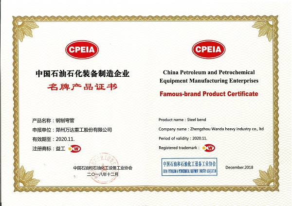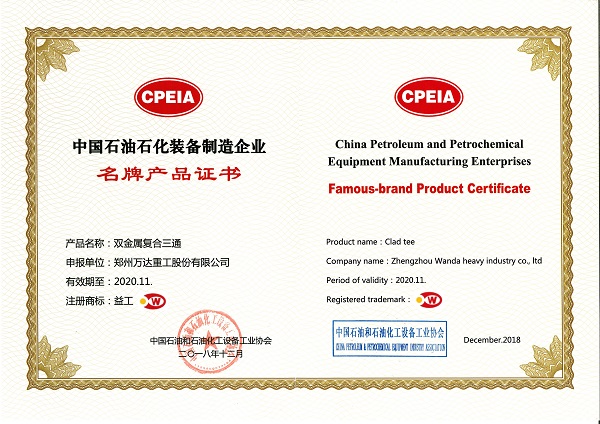 為了更好落實“中國制造2025”的發(fā)展戰(zhàn)略,培育企業(yè)具有科技創(chuàng)新水平的名牌產品,根據《中國石油石化裝備制造服務行業(yè)名牌產品評價推薦辦法》,按照中石協秘【2018】14號文的標準評價,萬達重工 “益工”品牌“雙金屬復合三通”和“鋼制彎管”兩種產品被中國石油和石油化工設備工業(yè)協會評定為“中國石油石化裝備制造企業(yè)名牌產品證書”。