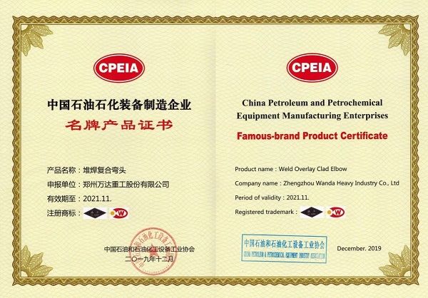 為更好落實(shí)“中國(guó)制造2025”的發(fā)展戰(zhàn)略,培育企業(yè)具有科技創(chuàng)新水平的名牌產(chǎn)品,根據(jù)《中國(guó)石油石化裝備制造服務(wù)行業(yè)名牌產(chǎn)品推薦辦法》規(guī)定,經(jīng)過(guò)企業(yè)自愿申報(bào)、行業(yè)部門初審、專家評(píng)審等環(huán)節(jié),萬(wàn)達(dá)重工 “益工”牌“堆焊復(fù)合彎頭”和“益工牌鋼制三通”等2類產(chǎn)品被中國(guó)石油和石油化工設(shè)備工業(yè)協(xié)會(huì)評(píng)定為中國(guó)石油石化裝備制造企業(yè)名牌產(chǎn)品并頒發(fā)證書。