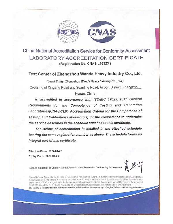 近日,鄭州萬達(dá)重工股份有限公司檢測中心順利通過中國合格評定國家認(rèn)可委員會(以下簡稱CNAS)的審核,并獲得CNAS實(shí)驗(yàn)室認(rèn)可證書(注冊號L16323),這標(biāo)志著萬達(dá)重工在實(shí)驗(yàn)室建設(shè)、試驗(yàn)及檢測能力和質(zhì)量保障等方面取得了新的成果,代表著公司的技術(shù)能力和管理水平具備國際水準(zhǔn)的規(guī)范性和公信力,提升了品牌影響力和企業(yè)的核心競爭力。