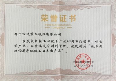 2019/03/06 614 改革開放40周年之際,在中國(guó)機(jī)械工業(yè)聯(lián)合會(huì)舉辦的機(jī)械工業(yè)杰出產(chǎn)品征集及宣傳活動(dòng)中,鄭州萬達(dá)重工股份有限公司雙金屬?gòu)?fù)合材料管件被選樹為改革開放40周年機(jī)械工業(yè)杰出產(chǎn)品。 該項(xiàng)榮譽(yù)的取得,標(biāo)志著我公司具有自主知識(shí)產(chǎn)權(quán)的雙金屬?gòu)?fù)合材料管件已經(jīng)能夠與當(dāng)今國(guó)內(nèi)外一流產(chǎn)品比肩,其具有的國(guó)際先進(jìn)水平已經(jīng)得到用戶認(rèn)可。